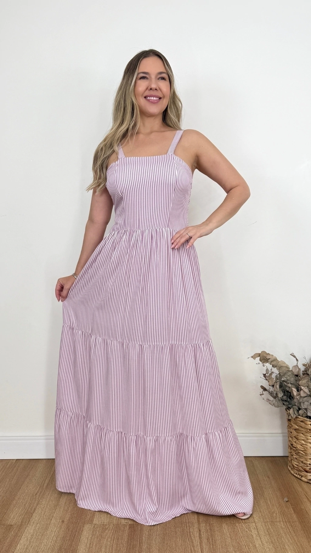 O Vestido Listrado Anny une elegância, conforto e leveza. Confeccionado em viscolinho com forro, possui decote reto e bojo embutido, com alças reguláveis que garantem ajuste perfeito.