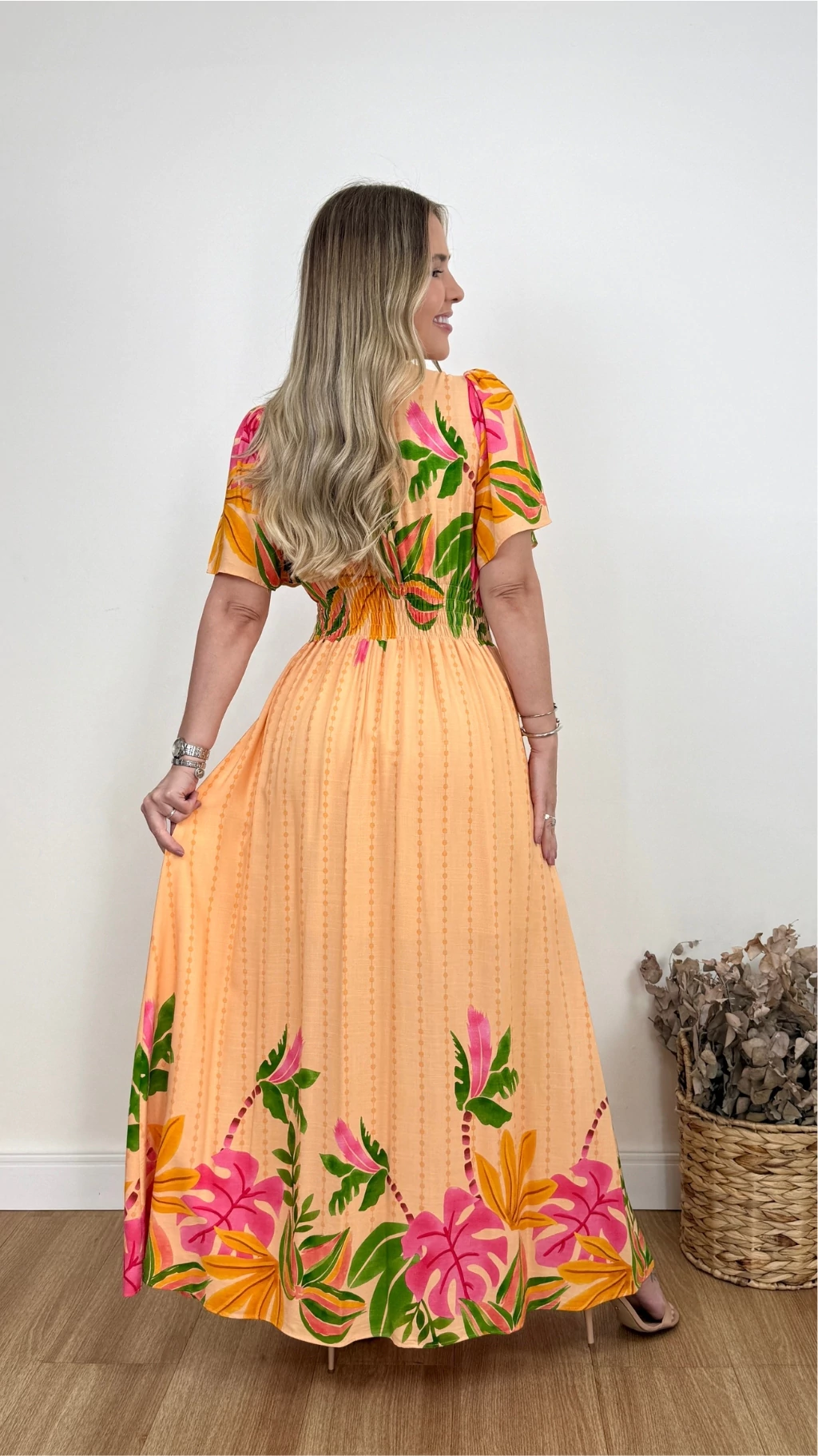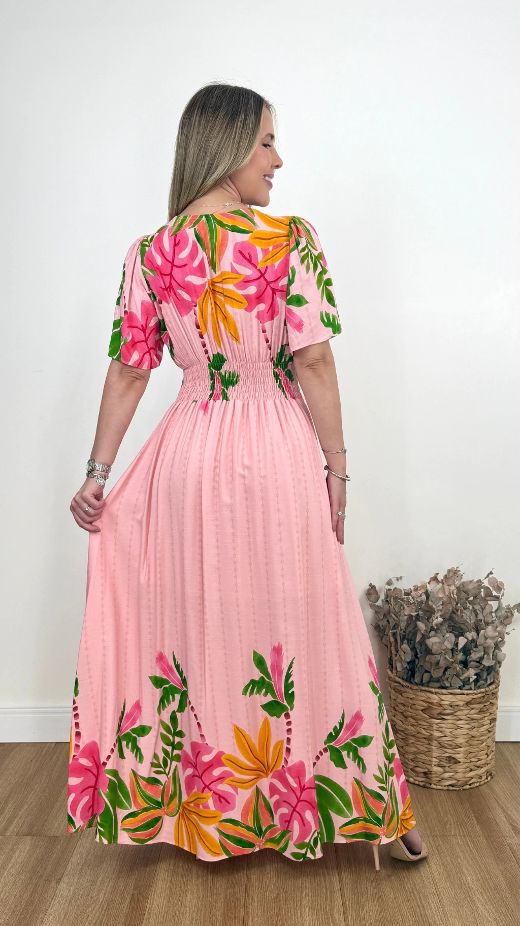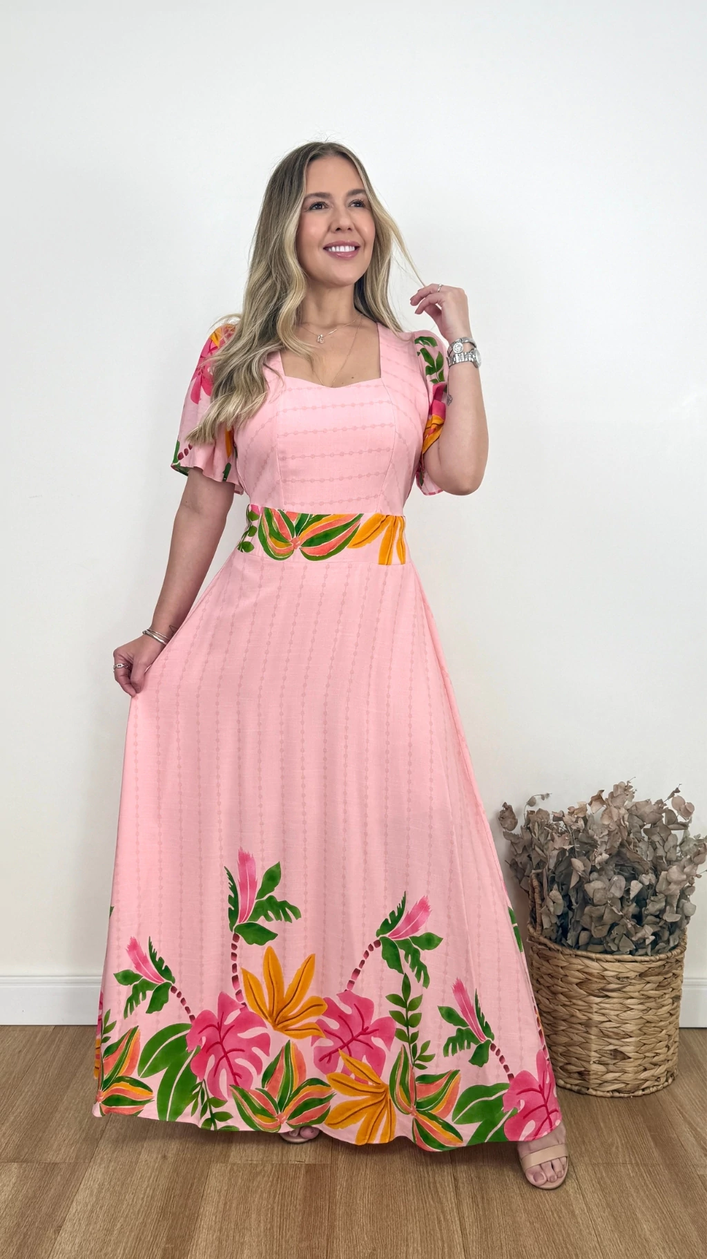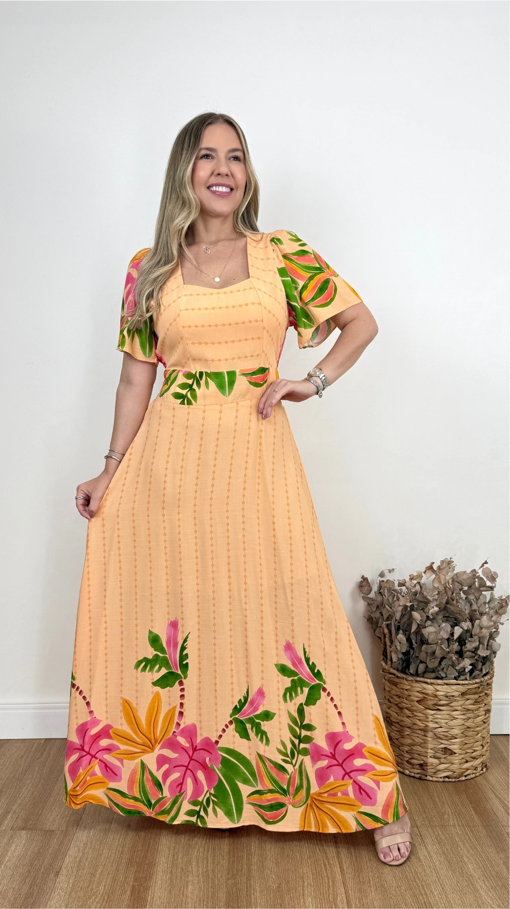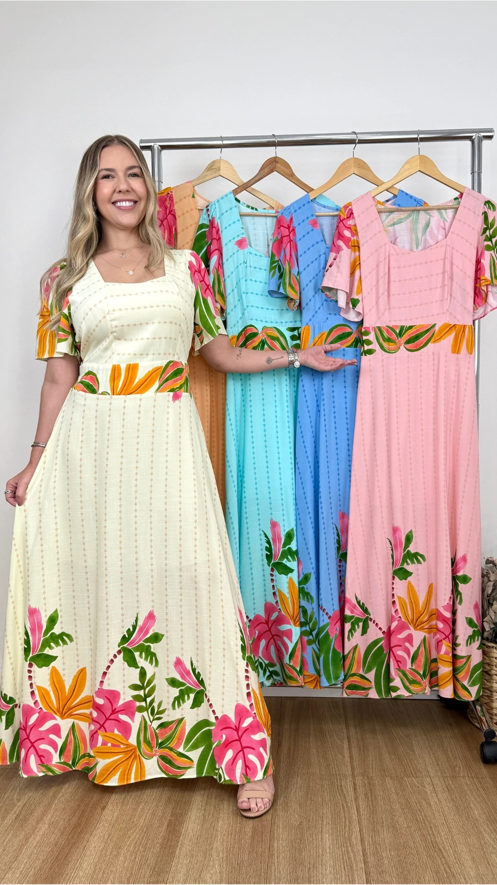O Vestido Sheron une delicadeza, conforto e elegância. Confeccionado em viscolinho, com forro e mangas godê, valoriza a silhueta e garante movimento e charme.